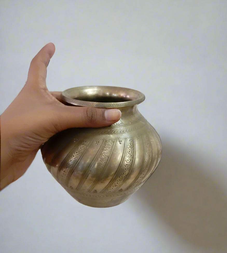 Vintage Brass Hand-Engraved Water Pot: Traditional Indian Pooja Vessel